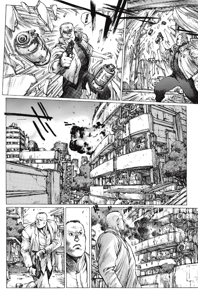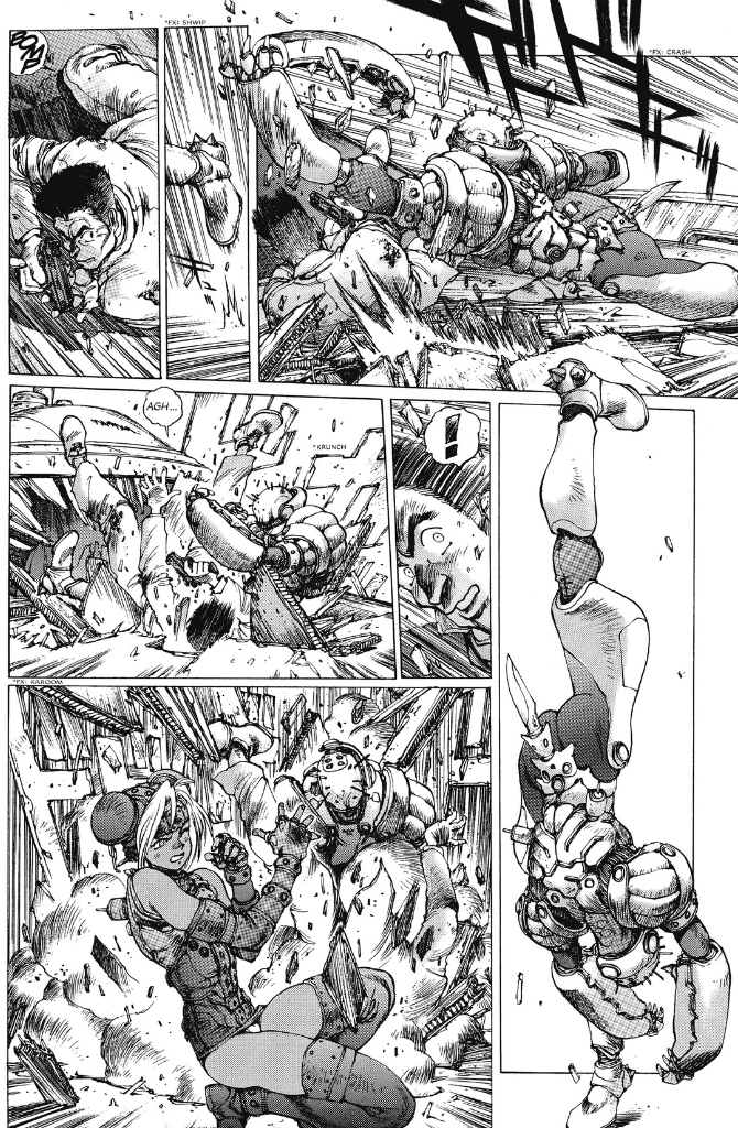 Obligée de faire équipe avec le service de renseignement de l’armée, la Section 9 se retrouve rapidement sur la piste d’un groupe de prisonniers de guerre soupçonnés de s’être livrés à du trafic d’armes… Cette histoire offre à Shirow l’opportunité de dessiner quelques scènes d’action hallucinantes, notamment un incroyable combat de cyborgs sur un bateau (dont une planche est reproduite un peu plus haut).